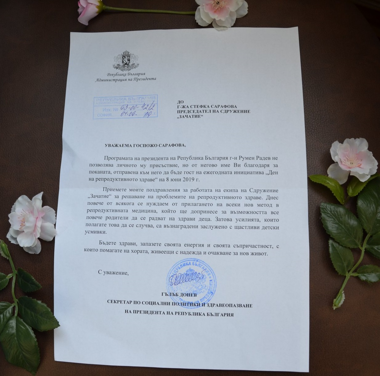 "Благодарение на Вашите неуморни усилия днес обществото ни приема нормално откритото говорене по теми като „стерилитет“ и „ин витро“. Днес е налице държавно финансиране за лечение на стерилитет чрез асистирани репродуктивни технологии. Радостна съм, защото с всяка изминала година виждам все по-мотивирани, заредени с позитивизъм и вярващи в доброто хора, които продължават да помагат на все повече двойки с репродуктивни проблеми. Вие дарявате надежда, подкрепа и много усмивки", каза заместник-министърът. Тя подчерта,че ни подкрепя и се чувства част от нас!