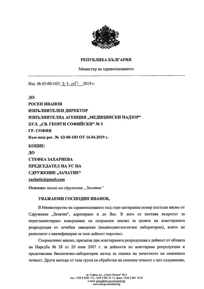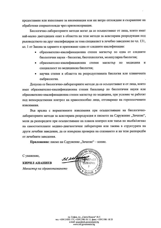 Писмо от министъра на здравеопазването Кирил Ананиев